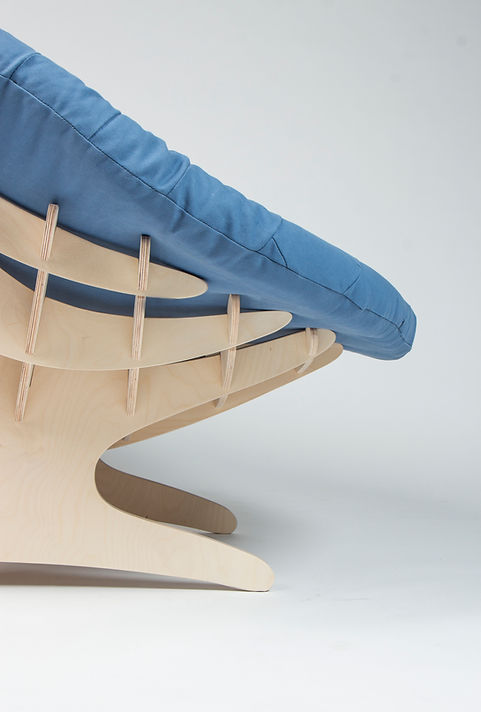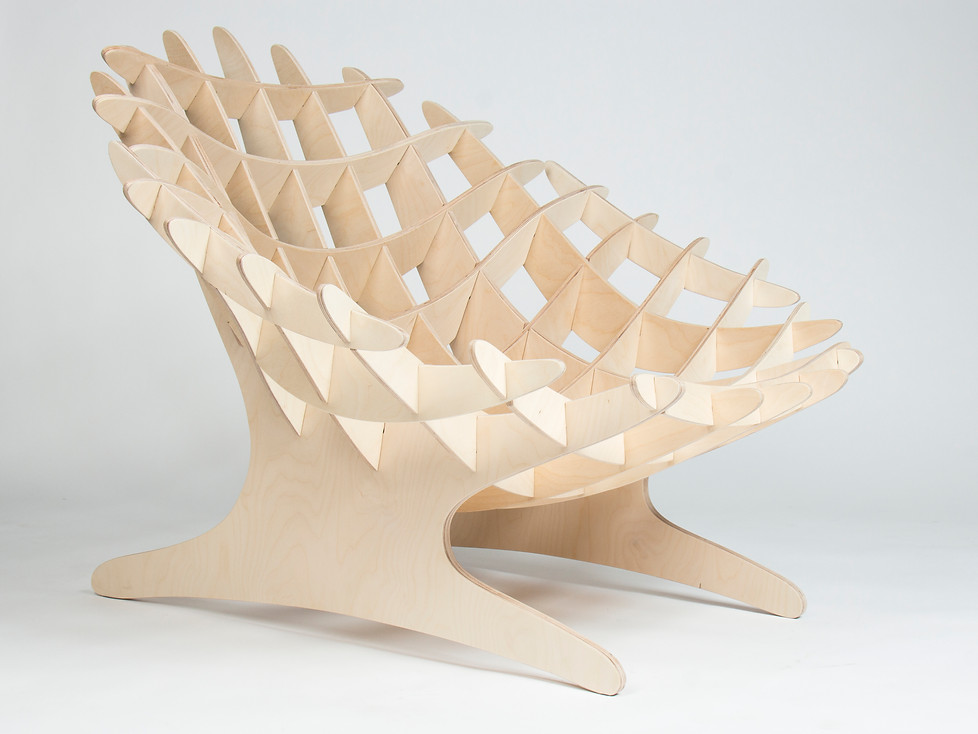 The waffle chair is CNC milled out of plywood (I used baltic birch). It is designed to be easily milled, shipped as a flat package, and assembled with no glue or adhesives. It can also be easily disassembled for easy moving. It's the perfect nest seat to sit back and relax in.
